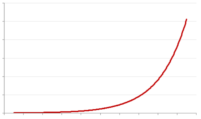 So that handles the newer competitors — how do you cater to experienced competitors at the same time? Firstly, I’d argue that it’s possible to make even easy problems cater to veterans — I think the aforementioned geometry problem and the riddle are cool (or at least interesting) results no matter how much math you’ve done. More importantly, though, I believe the correct strategy involves the difficulty gradient looking like an exponential curve. Something like this: